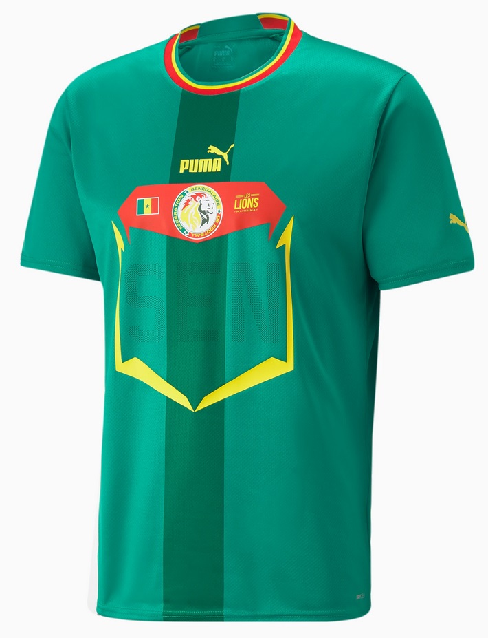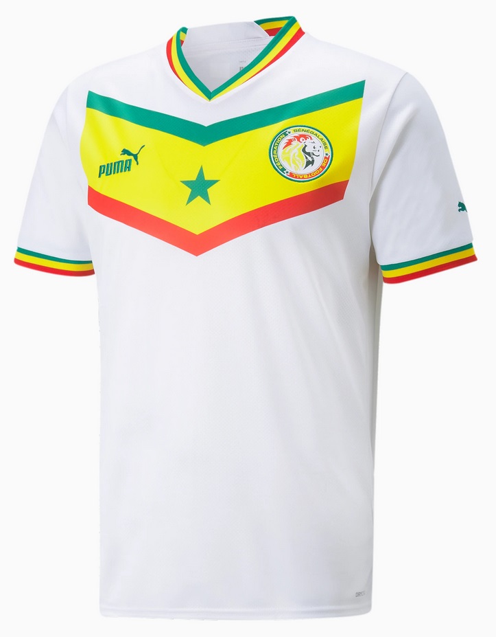 Chevron na klatce piersiowej na białej koszulce nie jest niczym odkrywczym, ale… Puma zadbała tu o to co w afrykańskich koszulkach kochamy – żeby kolory zagrały pierwszą rolę i uderzyły nas w oczy. Gdy tylko wzrok padnie na klatkę piersiową, od razy w jego zasięgu jest kołnierz oraz mankiety rękawów. Wszystko w kolorach flagi Senegalu. Bliskie ułożenie elementów mocno zaznacza swoją obecność na trykocie, czego właśnie bym oczekiwał po koszulce dla ekipy z Afryki. Mimo, że z początku wydawało mi się zbyt dużo bieli, powiedziałbym, że jednak wyszło poprawnie.