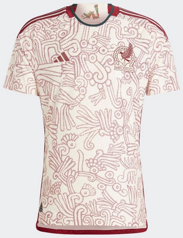To nie koniec, bo jest jeszcze wersja wyjazdowa. Miłośnicy bezpośrednich nawiązań do minionych czasów będą się tu rozkoszować każdym detalem. Wewnątrz kołnierza znajduje się rysunek wspomnianego wcześniej Quetzalcoatl, a cały trykot pokrywa rycina tejże grafiki. Trochę szkoda, że zrobiono to w dość chaotyczny sposób, ale mimo wszystko, należą się brawa za to, że Adidas kłania się Meksykowi i jego historii, nawiązując swoimi projektami do starożytnych cywilizacji.