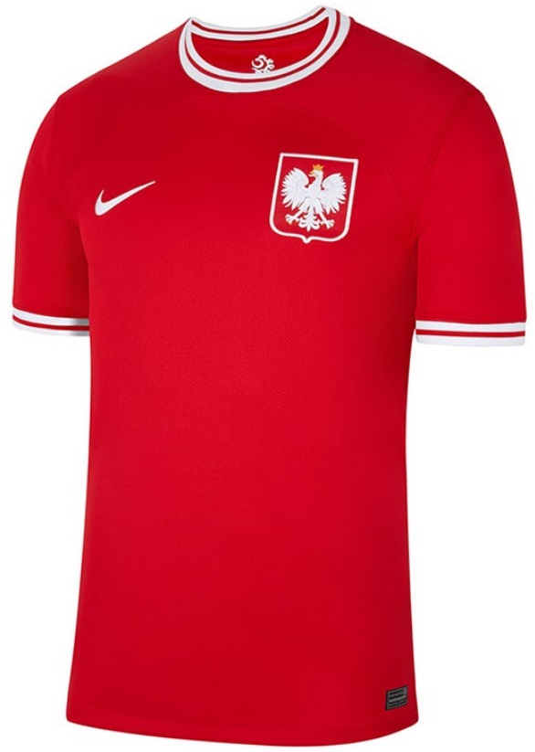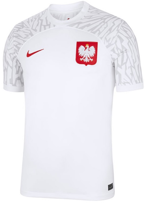Wersja domowa… Brakuje mi tego wszystkiego, co przed chwilą zobaczyliśmy u naszych grupowych rywali – jakiegoś specjalnego detalu, tudzież elementu nawiązania do naszego kraju. Gdyby herb Polski i Anglii zamienić miejscami, te zespoły mogłyby grać w tych koszulkach. Takiej sztuki z powyższym Meksykiem nie da rady zrobić. Niestety, ale Nike po raz trzeci na cztery ostatnie premiery, oferuje nam nudny projekt (2016, 2018 oraz 2022). Do standardowej bieli i czerwieni dobiera neutralną i nie wzbudzającą emocji siwiznę. Dla mnie te projekty są nudne, a tłumaczenie któryś raz z rzędu, że te szare paseczki nawiązują do naszego godła, czyli Orła Białego, są niedorzeczne.
