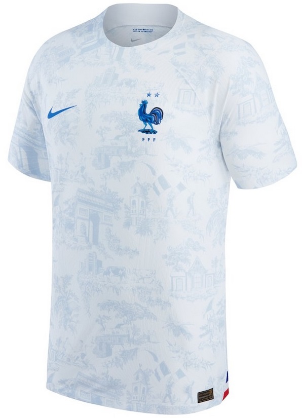 Wyjazdówka stoi w sporym kontraście, bo jest odważna i nieco szalona. Dla niektórych może być nawet zbyt chaotyczna. Trykot pokazuje i zawiera najważniejsze dla Francji elementy kultury i wydarzeń historycznych, jak i kojarzonych z nią krajobrazów. Znajdziemy tam między innym Łuk Triumfalny czy scenę z rewolucji francuskiej. Osobiście wolałbym bardziej uporządkowany model, natomiast Nike nieci porozrzucało te grafiki po koszulce. Mimo wszystko ukłony za nawiązanie do historii, gdyż zdecydowanie wolę takie projekty, niż zwykłe białe nudne koszulki, które widzieliśmy w przeszłości.