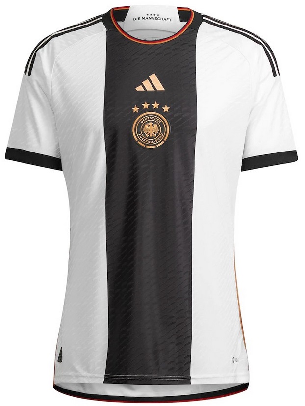 Niemców będzie widać z daleka, bo na obu trykotach dostali piękne złote wykończenia. Podstawowy trykot to właśnie klasa, której przed chwilą brakło w opisywanej Kostaryce. Gruby pionowy pas czerni zawiera w sobie złote emblematy, co daje zdecydowanie lepszy kontrast wizualny, niż gdyby były one na białej części materiału. Dodatkowo kołnierz oraz boczne łączenie paneli trykotu układają się w niemiecką flagę. Całość wygląda modernie i żywo, tak że nowe agresywniejsze logo Adidasa świetnie się tu wkomponowało.