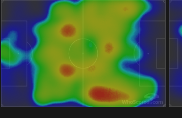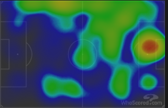 Jeszcze heat mapa, które biorę z portalu whoscored.com. Chcę Ci pokazać, że faktycznie graliśmy skrzydłowym po prawo, a obrońcą po lewo: