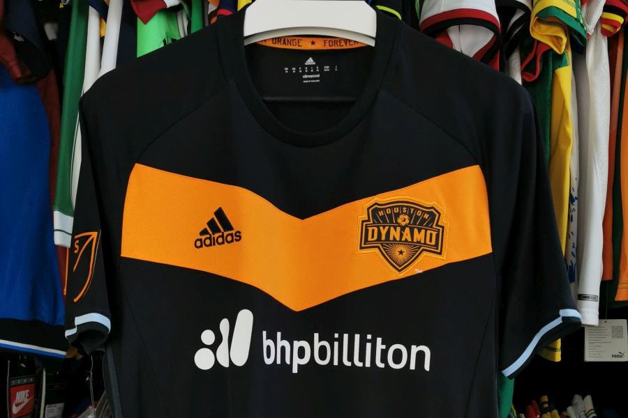 Spodobała mi się ta wyjazdówka. Delikatnie przypomina mi czarną koszulkę Manchesteru United z sezonu 2009/10, tyle że tam szewron był niebieski, a nie pomarańczowy. Tutaj kolor taki, a nie inny, ze względu na podstawowe barwy klubu z Houston. Widać to zresztą po napisie na taśmie w kołnierzu – forever orange. Projektanci ładnie skomponowali czerń i pomarańcz, nadając smaku temu modelowi.
