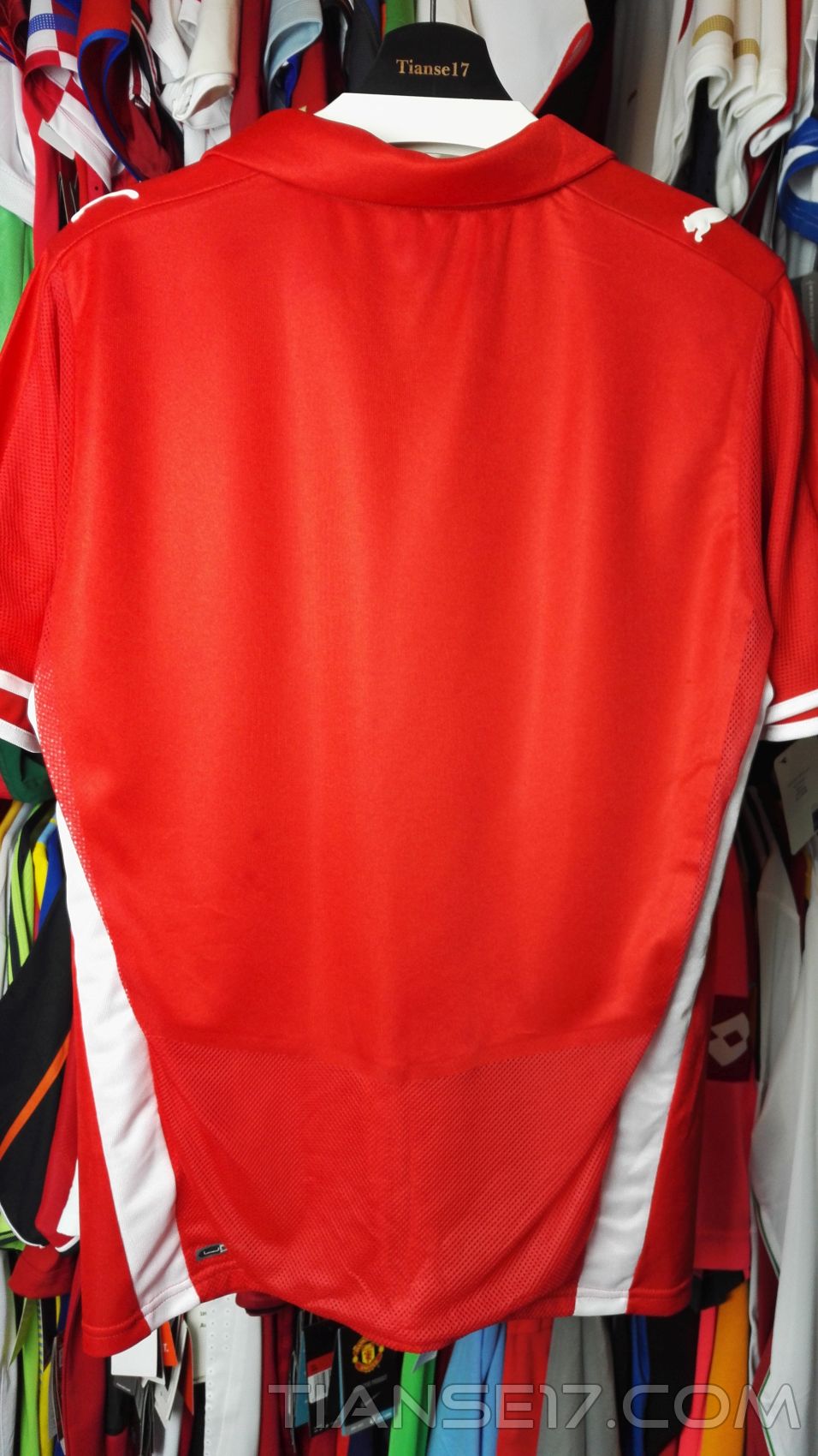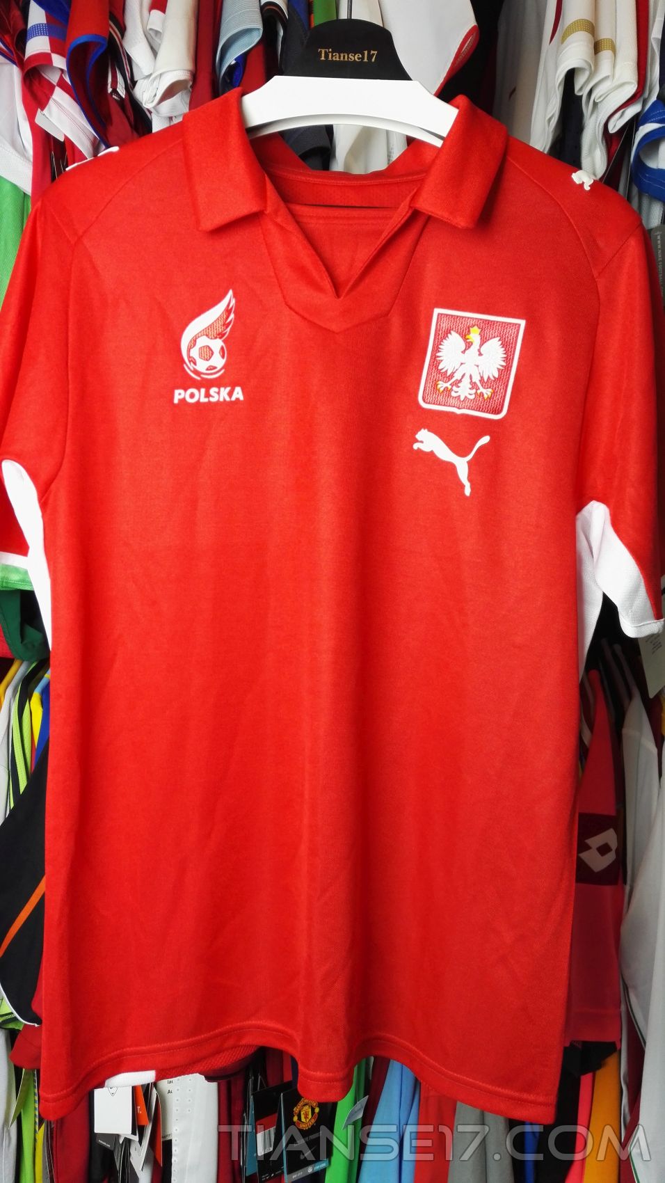 Pierwszy mecz w historii Mistrzostw Europy Polska zagrała w tym czerwonym modelu. Przeszedł on więc do historii jako świadek wydarzenia, na które Polacy musieli czekać przez dziesiątki lat. Muszę przyznać, że nie porywa on swoim wyglądem, tym bardziej że jest nieco dziwny. Puma swoje logo umieszczała pod emblematem znajdującym się na lewej piersi. Z racji iż Polska już w 2006 roku dała lekcję odnośnie posiadania godła na koszulkach, nie wygląda to aż tak dziwnie jak na tych koszulkach, gdzie na prawej piersi nie znajdowało się kompletnie nic. W zasadzie lubię takie jednorazowe udziwnienia, bo sprawiają, że dany trykot na swój sposób staje się wyjątkowy. Inny. I wzrasta różnorodność.