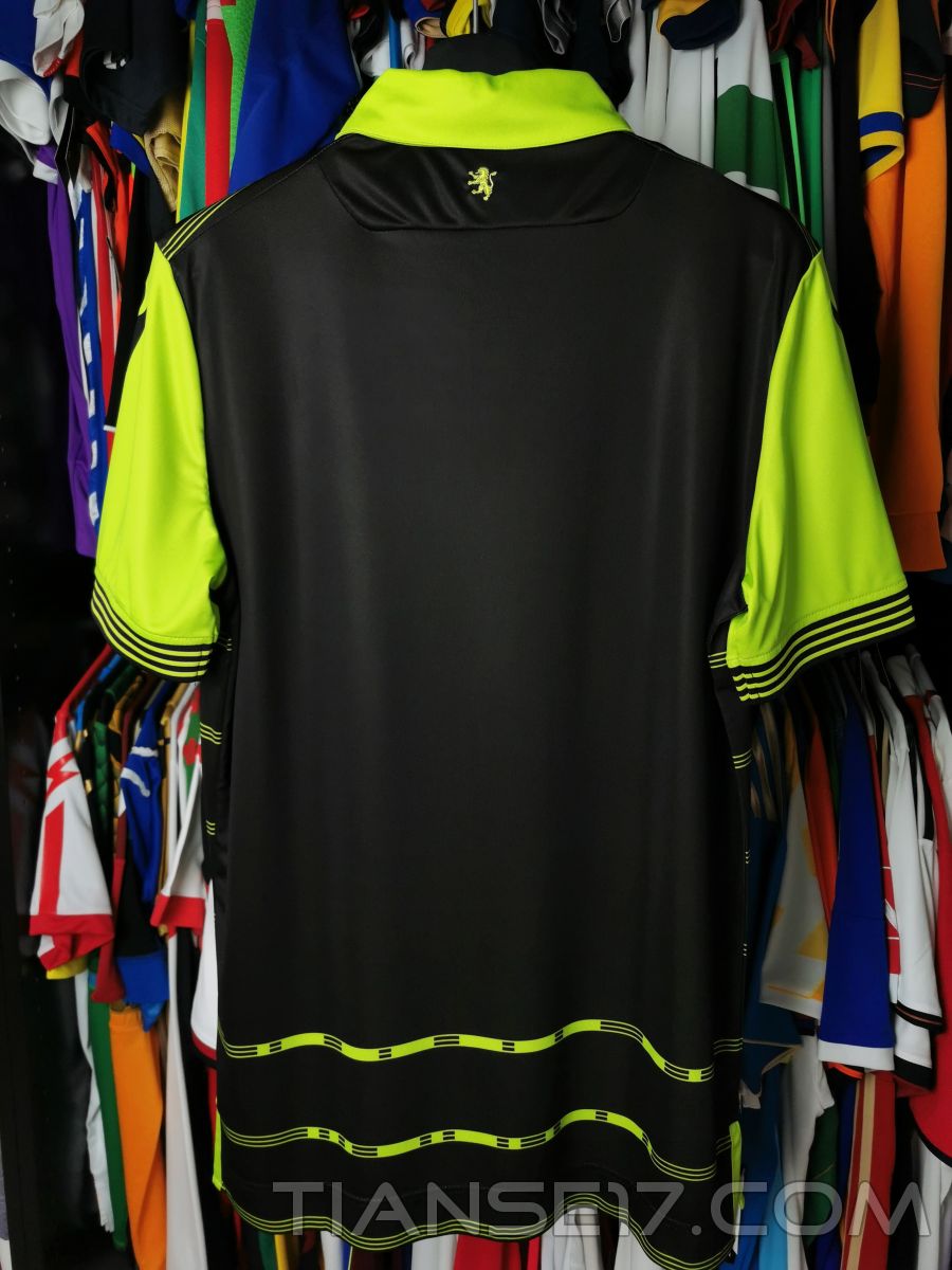 Motywem głównym jest zakodowana alfabetem Morse’a przyśpiewka fanów Sportingu. Kropki i kreski, z których składa się kodowanie liter w tym systemie, zostały sprytnie wkomponowane w trój-linię z herbu. Ta zaś odnosi się do poziomych pasów, które są charakterystyczne dla klubu. Na uznanie zasługuje fakt, że udało się wypuścić wersje bez sponsora głównego (był także ze sponsorem). Otrzymaliśmy świetnie zrealizowany pomysł, który nie został w żaden sposób zaburzony.
